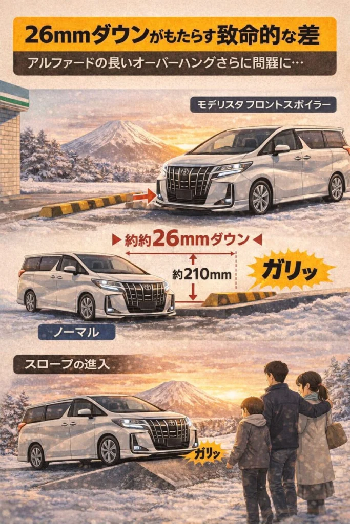 しかし、アルファードのようなオーバーハング(タイヤからバンパー先端までの距離)が長い車にとって、この約3cmの低下は致命的な差となります。