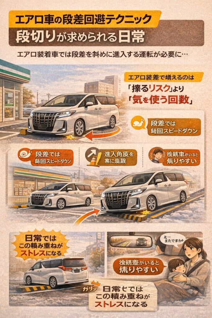 アルファードのエアロパーツは見た目の迫力を増す一方で、日常の運転に多くのストレスと制約をもたらします。