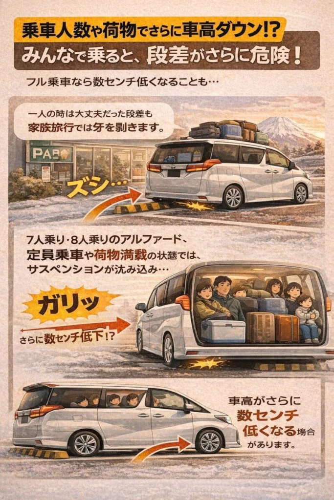 「一人の時は大丈夫だった段差」が、家族旅行では牙を剥くことがあります。 アルファードは7〜8人乗りですが、定員乗車や荷物を満載にした場合、サスペンションが沈み込み、車高がさらに数センチ下がることがあります。
