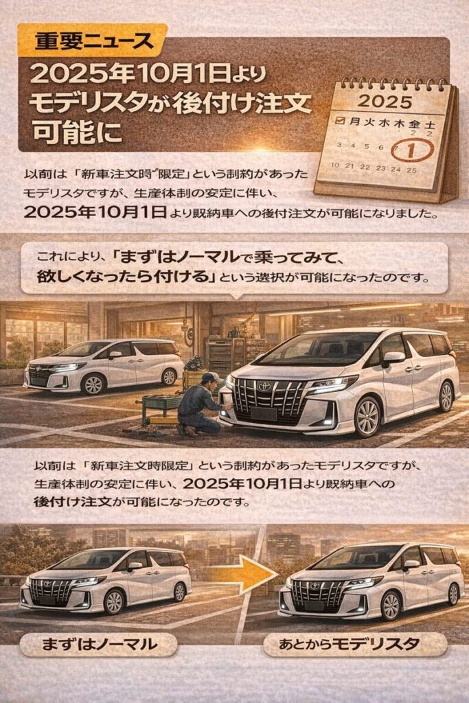 - 2025年10月より既納車へのモデリスタ後付けが可能になり急いで決める必要がない