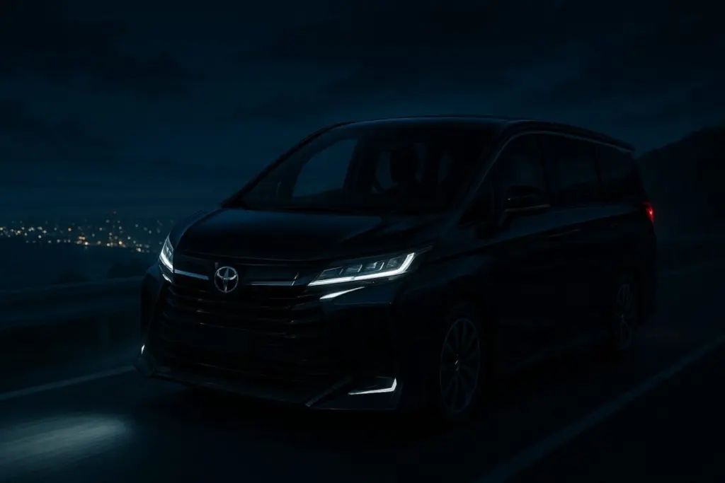- ヴェルファイア(アグレッシブ・先進):同じコンセプトながら、こちらは「ドライバーズカー」としての解釈です。漆黒メッキや水平基調のバーを多用し、鋭い眼光を放つ2段ヘッドライトが特徴。アルファードが「盾」なら、ヴェルファイアは「剣」のような鋭さがあり、「動の洗練さ」を強調しています。