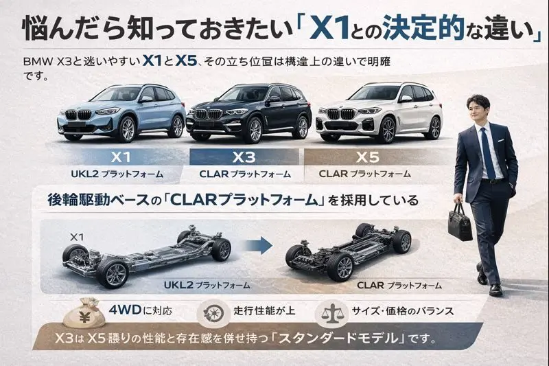 X3を検討する際、必ず迷うのがX1とX5です。しかし、車の構造(プラットフォーム)を見ると、その立ち位置は明確に異なります。