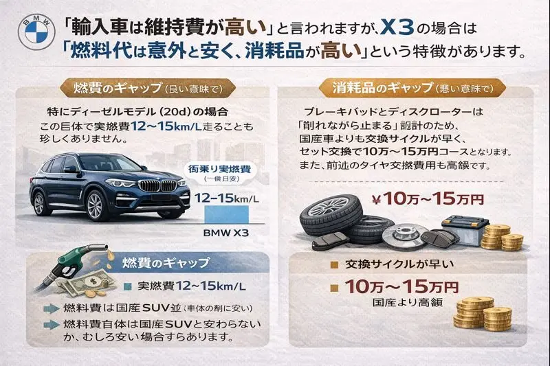 「輸入車は維持費が高い」と言われますが、X3の場合は「燃料代は意外と安く、消耗品が高い」という特徴があります。
