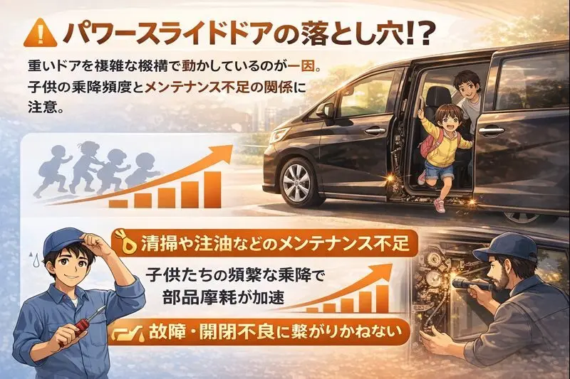 • パワースライドドアは経年劣化や砂噛みで故障しやすく修理費は片側5〜10万円かかる