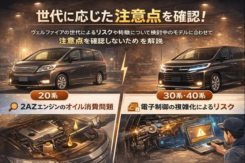 ヴェルファイアは世代によって抱えているリスクや特徴が異なります。検討中のモデルに合わせて注意点を確認しましょう。